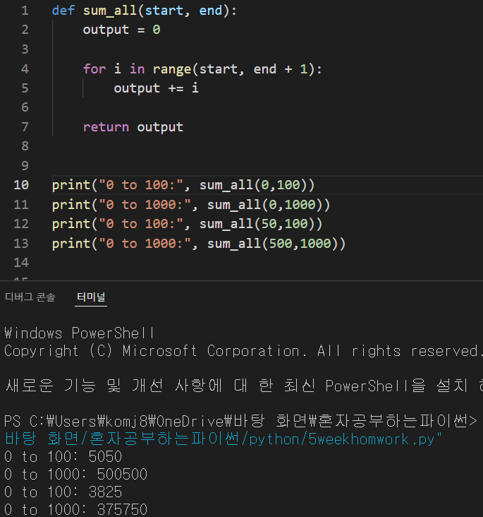 [์ง์ ํด๋ณด๋ ์์ฝ๋ฉ : ๋ฒ์ ๋ด๋ถ์ ์ ์๋ฅผ ๋ชจ๋ ๋ํ๋ ํจ์] ์คํ ํ ์ฝ๋๊ฐ ์