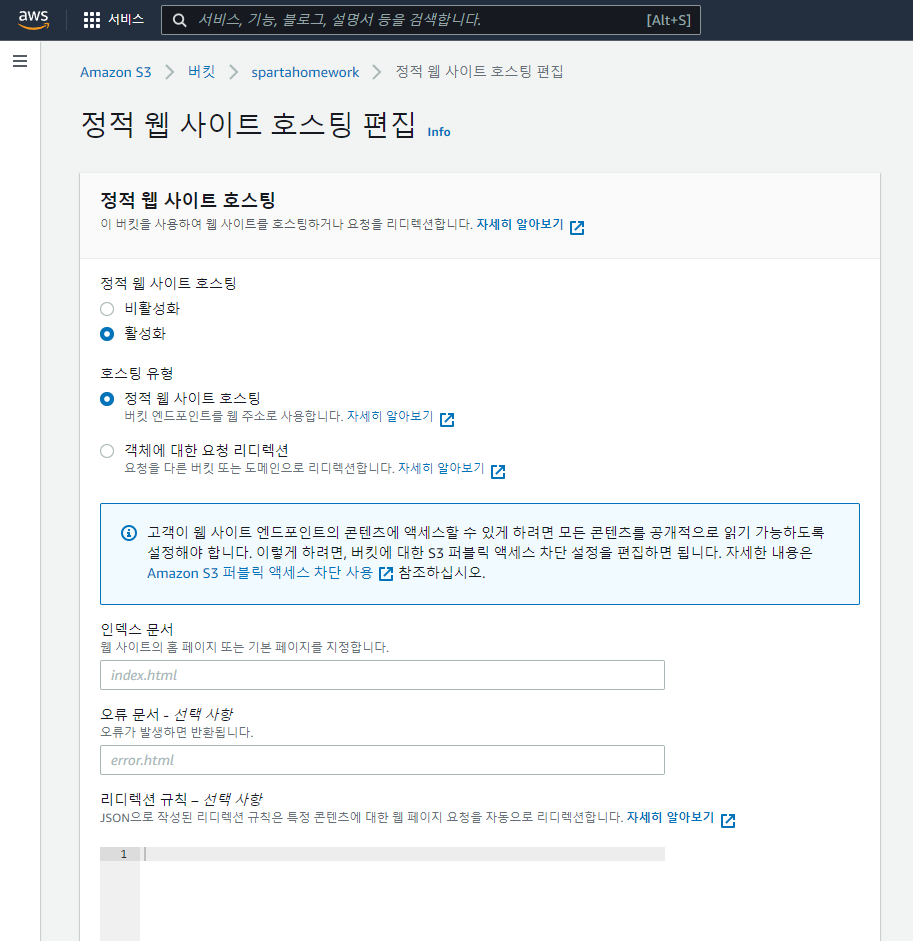 (1) S3 ์ ์ ํธ์คํ ๊ธฐ๋ฅ ์ค์