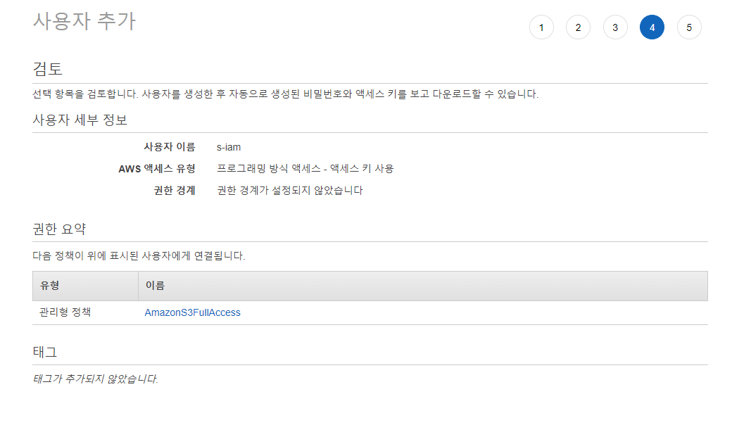 โ S3๋ฅผ ์ํ ์ฌ์ฉ์์ด๋ฏ๋ก AmazonS3FullAccess ๊ถํ ๋ถ์ฌ.